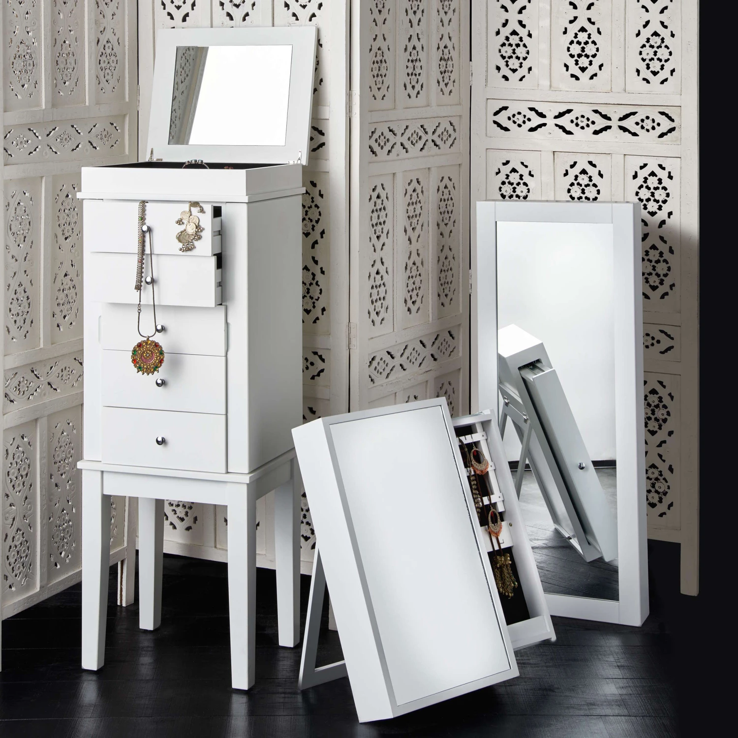 Als stamme er aus einer spanischen Finca, einer italienischen Villa oder einer portugiesischen Posada: Unser weißer Estella-Paravent mit femininen Ornamenten versehen, präsentiert sich charmant nostalgisch und aufwändig gearbeitet. Mit Liebe für das Detail. Denn er wurde von Hand gefertigt und bemalt. Ob als Raumteiler, als Sichtschutz oder Dekoelement: Der Paravent im Vintage-Look ist vielseitig nutzbar und weist zu dem einen modernen Shabby-Chic-Stil auf.