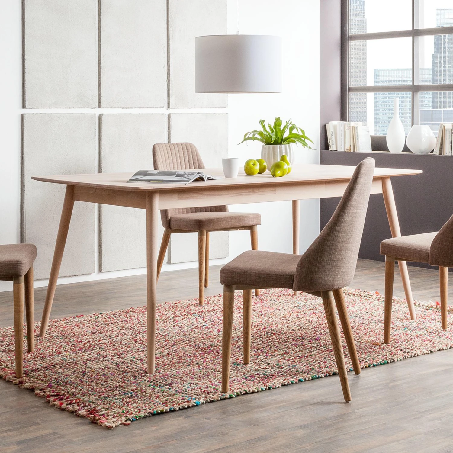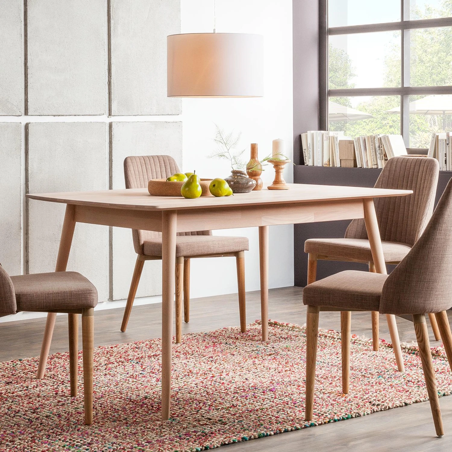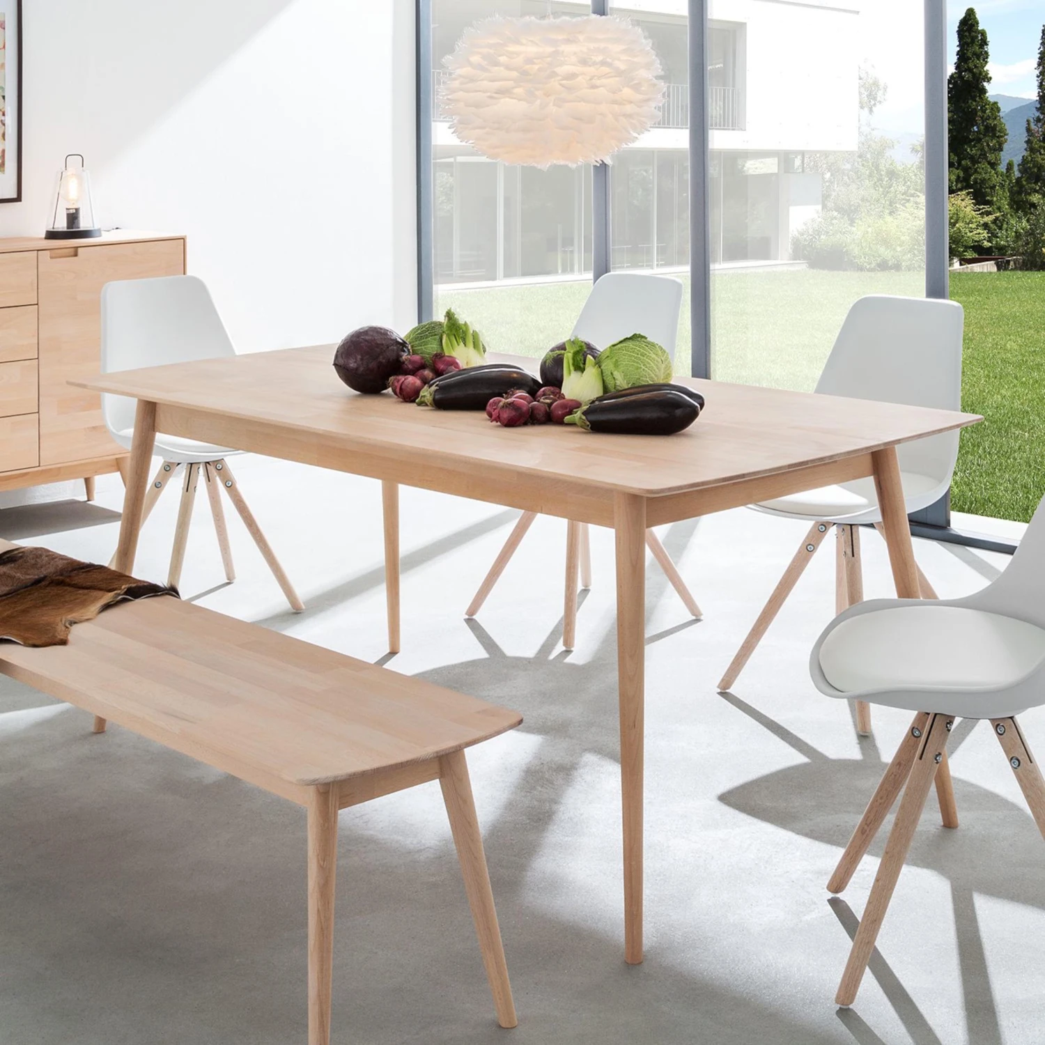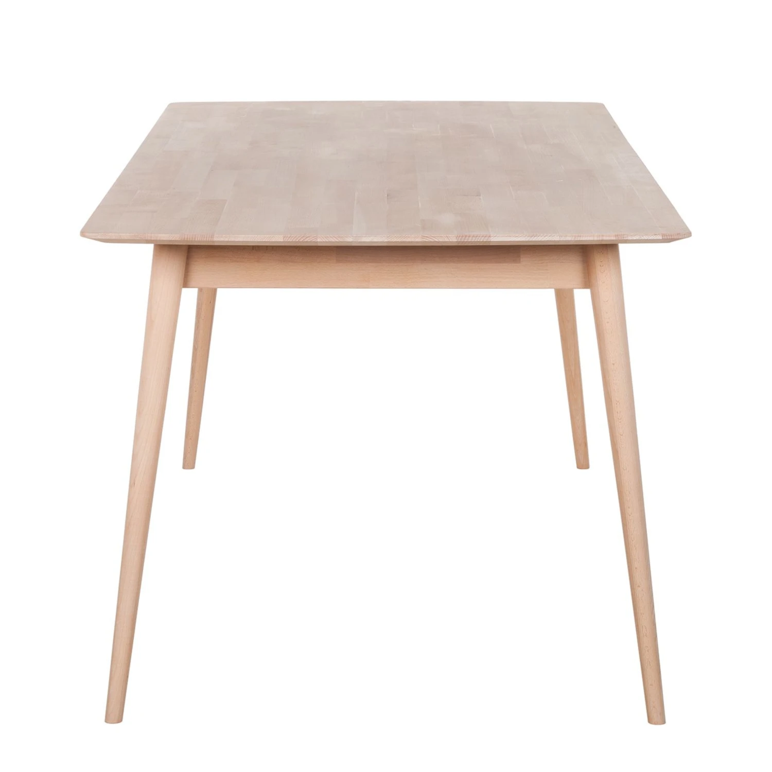 Der Esstisch Finsby I in hochwertiger Verarbeitung überzeugt mit viel hellem Holz und klarem geradlinigem Design. Das Möbelstück aus massiver Buche im skandinavischen Design ist auch in kleinen Ess- und Wohnbereichen ein schöner Treffpunkt für die Familie. Die nach außen schräg gestellten Beine werden nach unten schmaler und geben dem Tisch eine luftige und schlanke Silhouette sowie Standfestigkeit. Durch das helle Holz und die dünne Tischplatte sorgt der Esstisch Finsby I für ein freundliches und natürliches Ambiente.