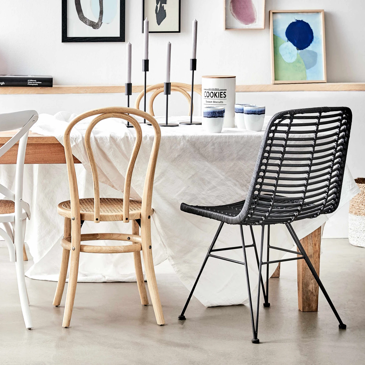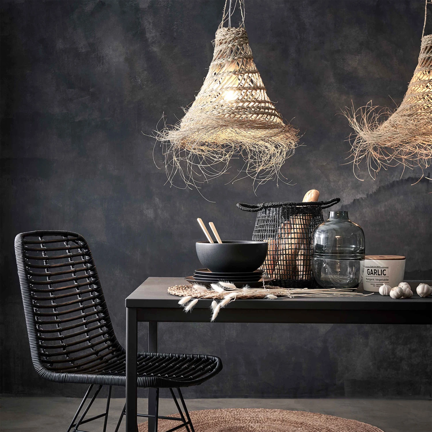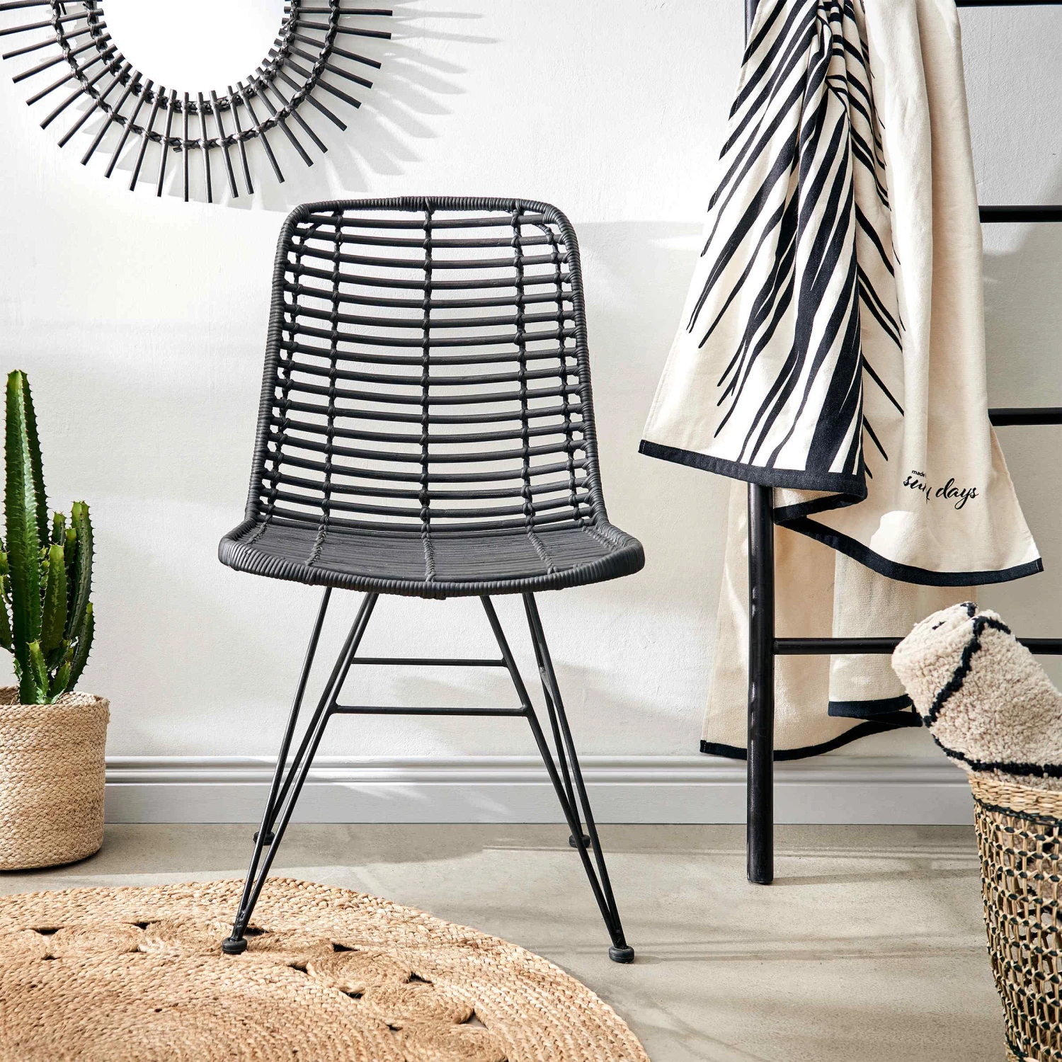 Mit unserem Rattan-Stuhl Hacienda setzen Sie in der Küche oder im Esszimmer auf moderne Lässigkeit und unkompliziertes Wohnen. Das Design mit Rattan und schwarzem Eisen-Gestell wirkt optisch angenehm leicht und erhält mit einem Kissen oder Lammfell im Handumdrehen eine noch individuellere Note. Da Rattan ein Naturmaterial ist, kann es hierbei zu Unregelmäßigkeiten in der Farbgebung kommen, die den natürlichen Charakter des Sitzmöbels unterstreichen. Auch als Stuhl mit Armlehnen erhältlich.