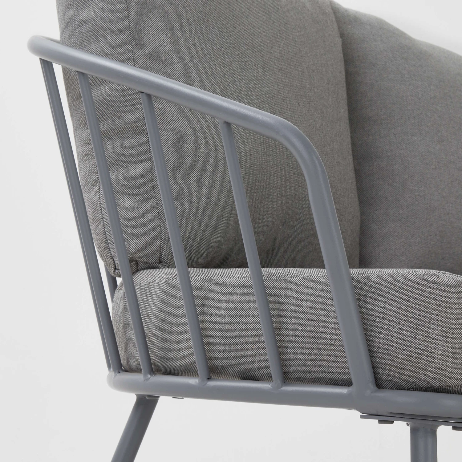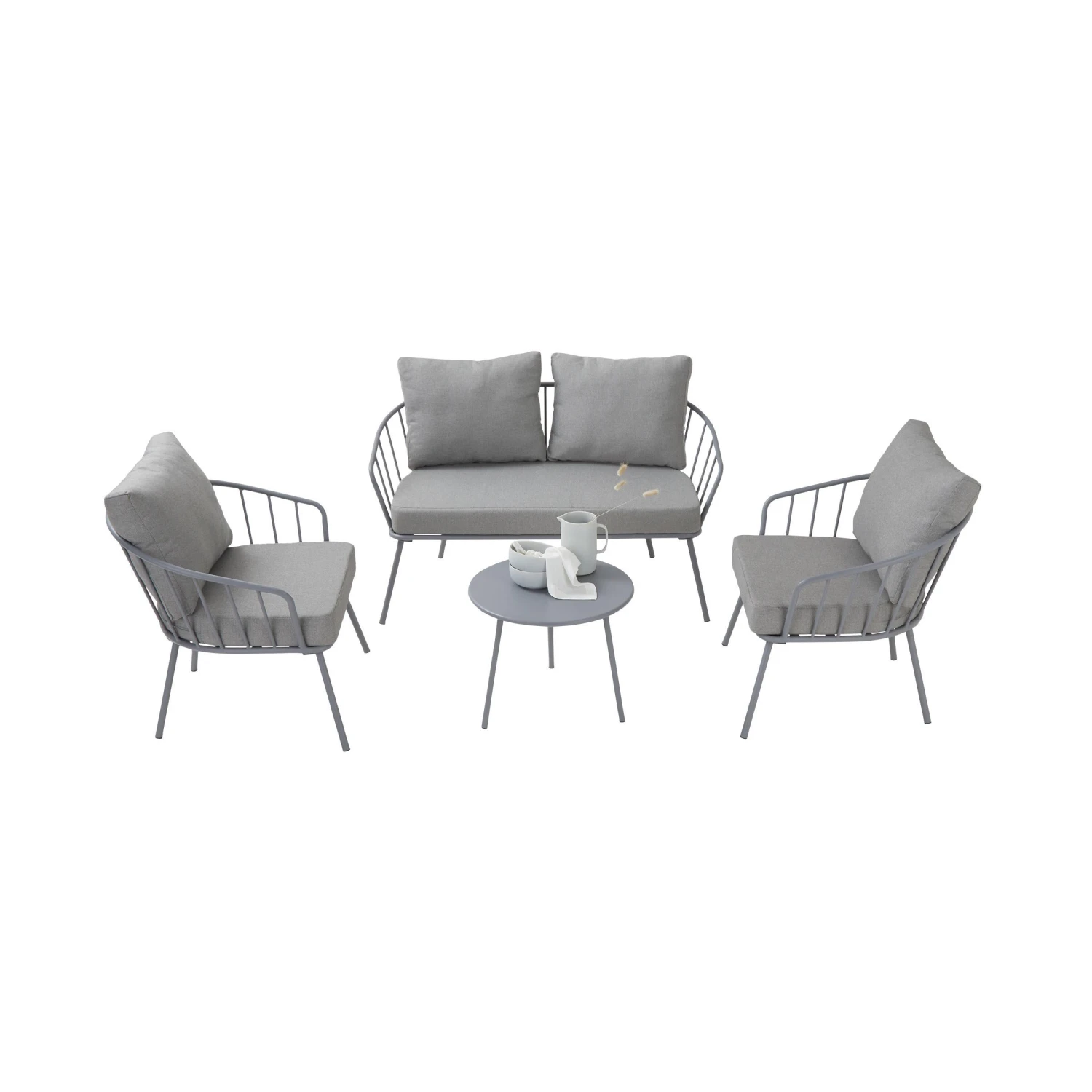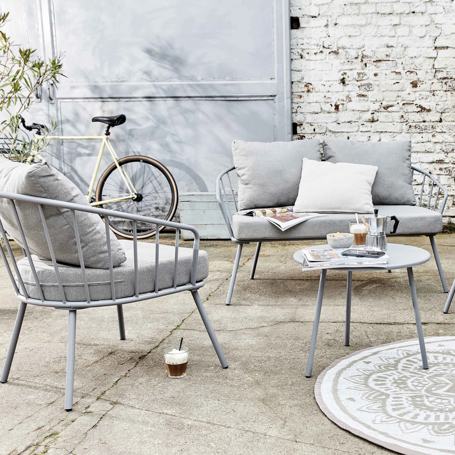 Teatime und Kaffeepause finden ab jetzt nur noch im Freien statt mit den 4-teiligen Junto Lounge-Set in Grau für Balkon oder Terrasse. Die angenehm gepolsterten Sessel und der 2-Sitzer kommen mit 43 cm Sitzhöhe einem normalen Stuhl nahe. Dazu gesellt sich ein runder Tisch, der flexibel zwischen oder neben den Sitzmöbeln platziert werden kann. Das moderne, leichte Design unterstreicht die Idee vom unkomplizierten Outdoor-Wohnen noch, und das Set nimmt optisch nicht zu viel Raum ein. Ein bisschen Unbeschwertheit – für eine Outdoor-Saison mit vielen entspannten Momenten.