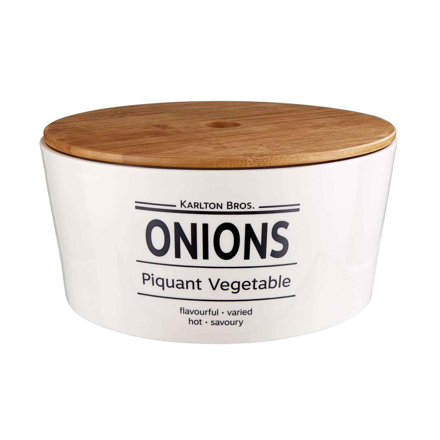 Der Karlton Bros. Zwiebeltopf im skandinavischen Landhausstil sieht nicht nur schön aus, sondern er ermöglicht auch eine ideale Lagerung Ihrer Zwiebeln. Der Zwiebeltopf mit Bambusdeckel und Silikondichtung bietet einen optimalen Schutz vor Licht und Feuchtigkeit, sodass die Zwiebeln besonders lange frisch bleiben. Zudem schützt der Porzellan Topf durch den Deckel die umliegenden Lebensmittel vor Aroma-Übertragung, damit Sie den Topf voller Zwiebeln bedenkenlos überall in der Küche platzieren können. Ob auf dem Regal oder im Vorratsschrank, der runde Zwiebeltopf mit einem 22 cm Durchmesser macht immer eine gute Figur. Um das Bild perfekt zu machen, gibt es auch den passenden Knoblauchtopf und andere Vorratsbehälter im skandinavischen Design aus der Karlton Bros. Serie für Ihre Küche.