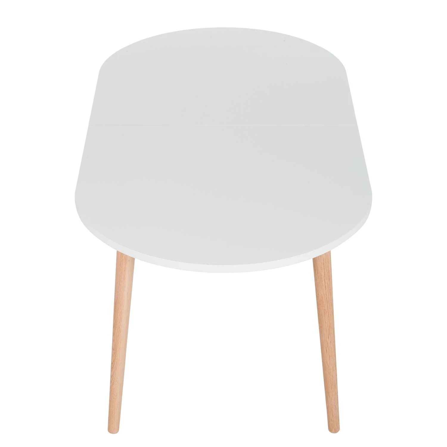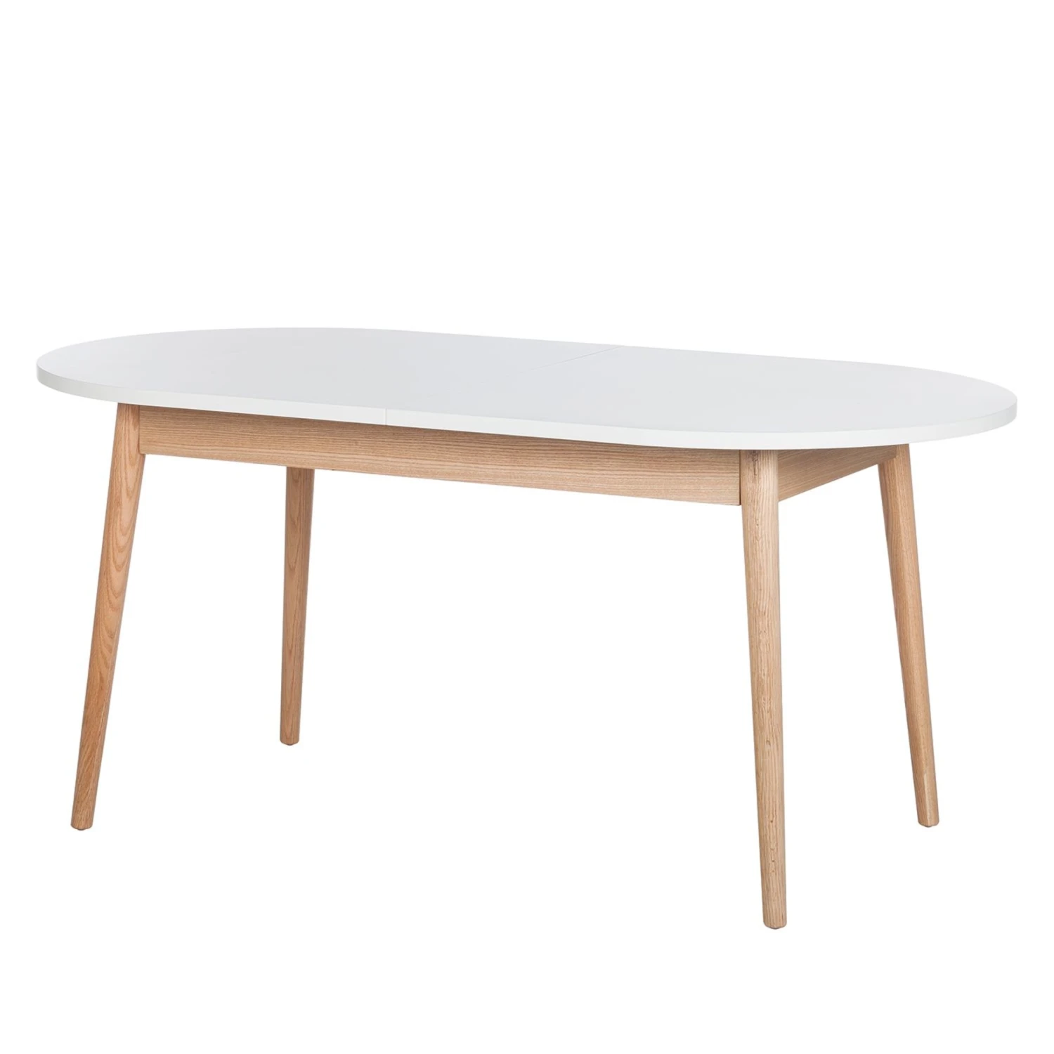 Der ausziehbare Esstisch aus der Serie Lindholm ist eine echte Empfehlung für alle Freunde des skandinavischen Looks. Er kombiniert eine ovale Platte aus MDF in mattem Weiß mit massiven Eichenholzbeinen. Während er sich durch optische Leichtigkeit auszeichnet, steht er doch fest und stabil. Seine Tischplatte kann mit wenigen Handgriffen erweitert werden, das Ergänzungsstück wird im Tisch gelagert.