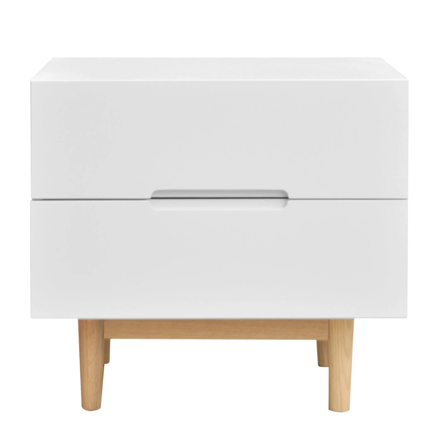 Der stilvolle Nachtschrank Lindholm ergänzt perfekt eine moderne schicke Einrichtung im skandinavischen Stil. Die kleine Kommode im zeitlosen Design verschafft mit ihrer schlichten Formgebung und dem gelungenen Kontrast zwischen dem mattweiß lackierten Korpus und den natürlichen Holzbeinen jedem Schlafzimmer eine wohnliche und gemütliche Atmosphäre. Aus MDF-Platten der Güteklasse E1 gefertigt ist der Nachtschrank ein robustes und qualitativ hochwertiges Möbelstück. Die beiden großen Schubläden mit eingearbeiteten Griffen bieten ausreichend Stauraum und Platz für Bücher und viele andere Dinge.