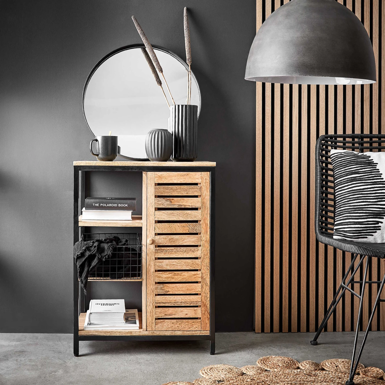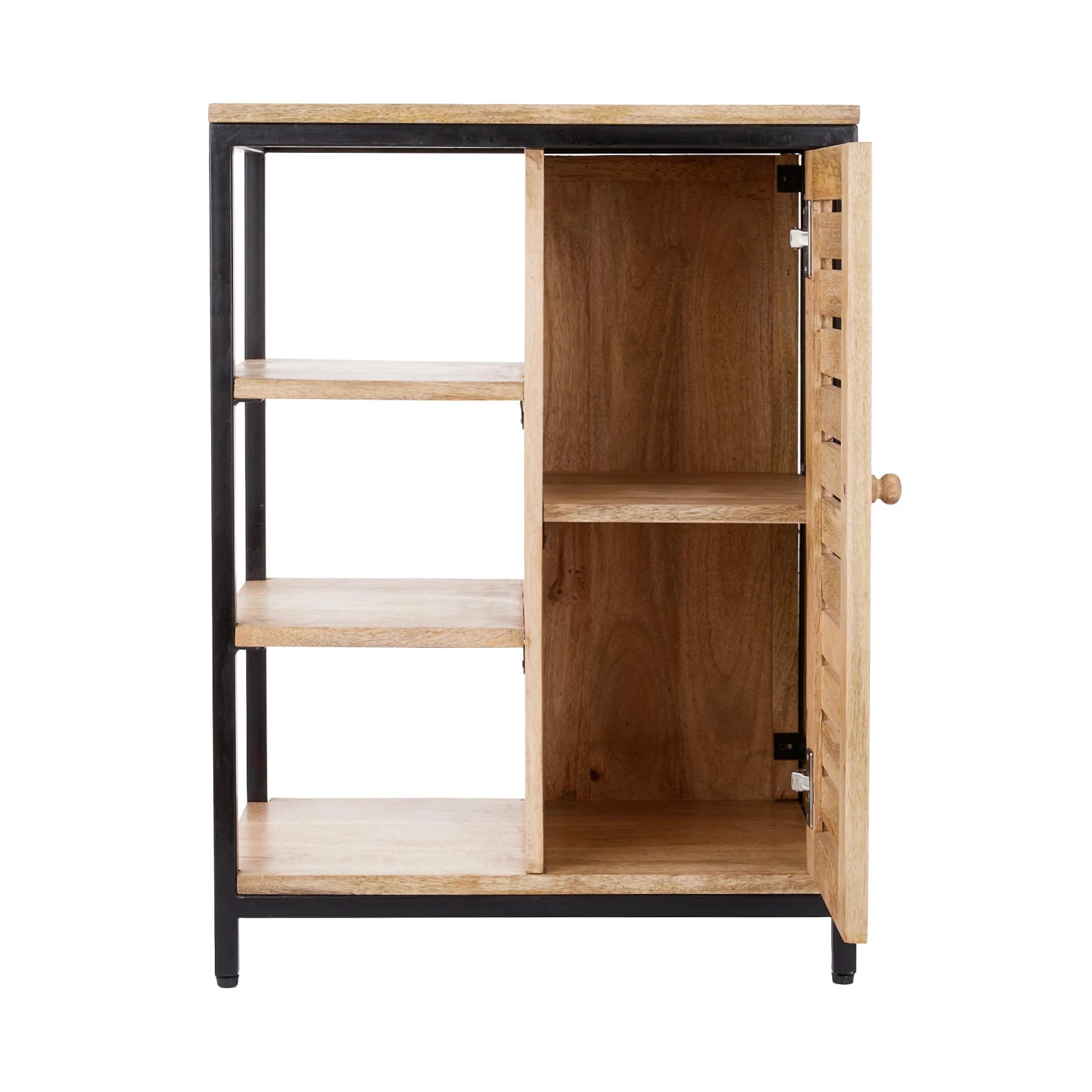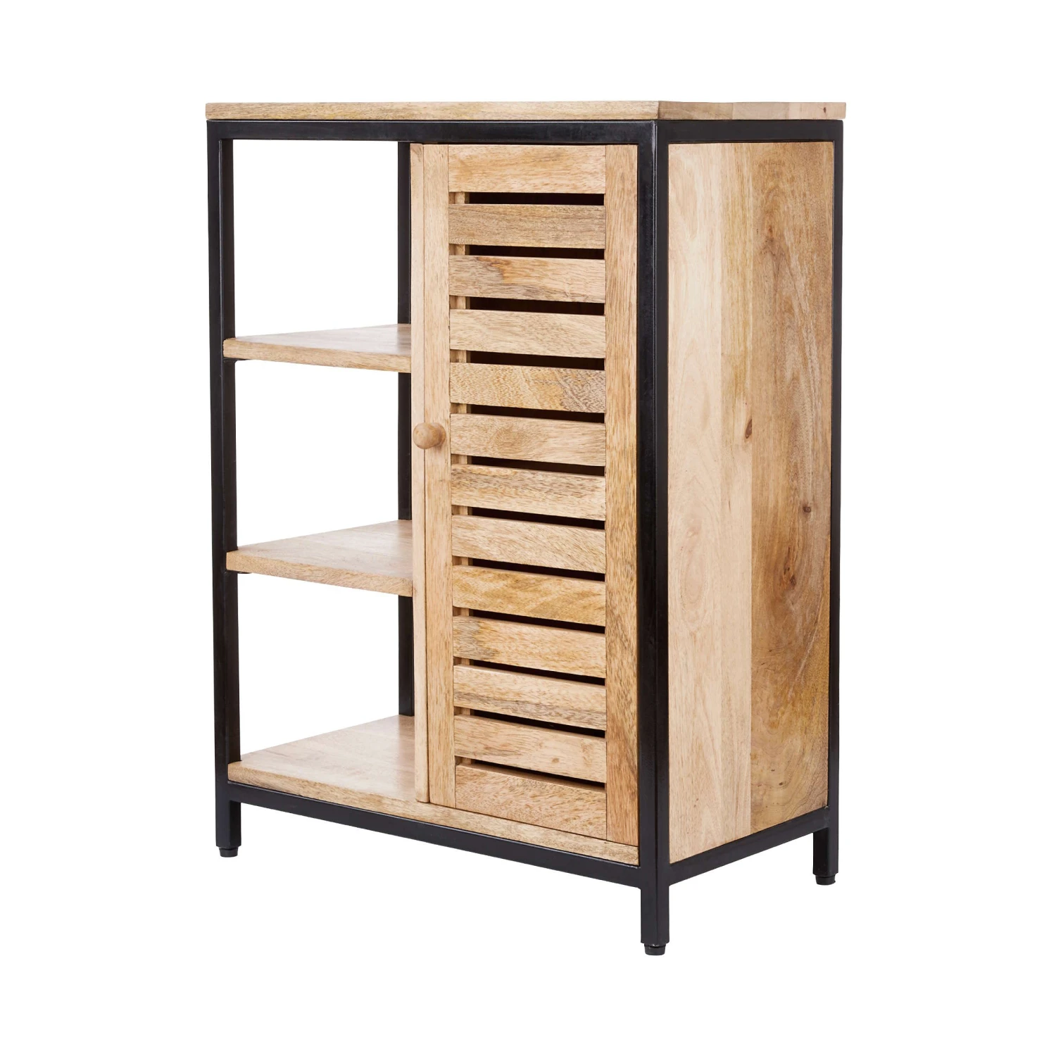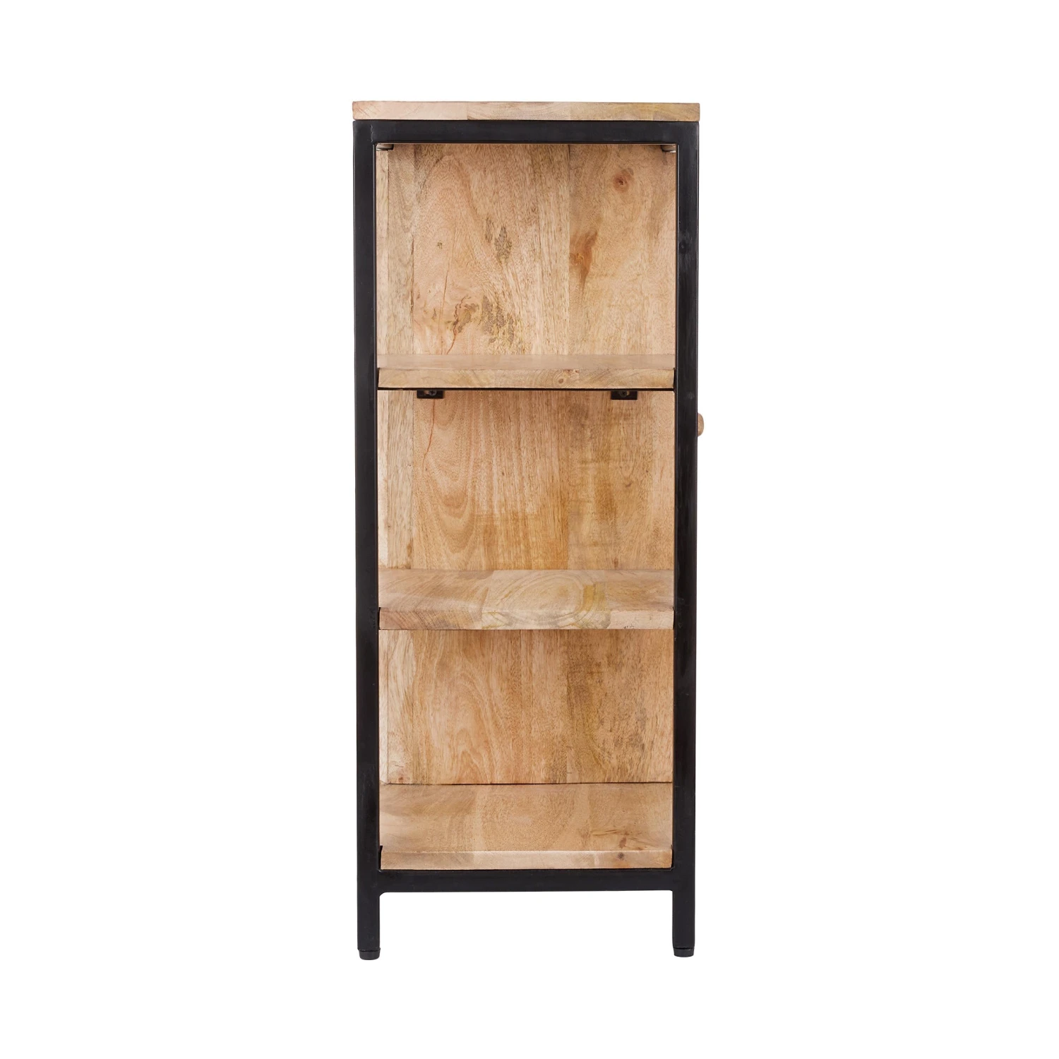 Ob im Flur oder Home Office: Das Mangoline Schränkchen aus Mangoholz und schwarzem Metall gibt überall ein hübsches Bild ab, wo dies und das zu verstauen oder abzulegen ist. Neben den drei offenen Fächern bietet es zwei weitere Fächer hinter der Tür, und oben auf der Ablagefläche finden z.B. Deko-Objekte, Korbschalen, Tabletts oder andere Accessoires zur Aufbewahrung Platz. Die moderne Kombination aus warm schimmerndem Holz und kühlem Metall in Schwarz lässt sich dabei gut mit den verschiedensten Einrichtungsstilen kombinieren.