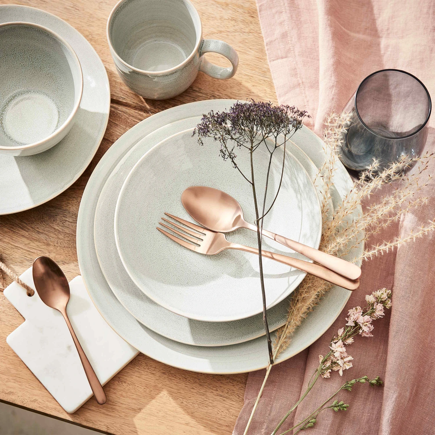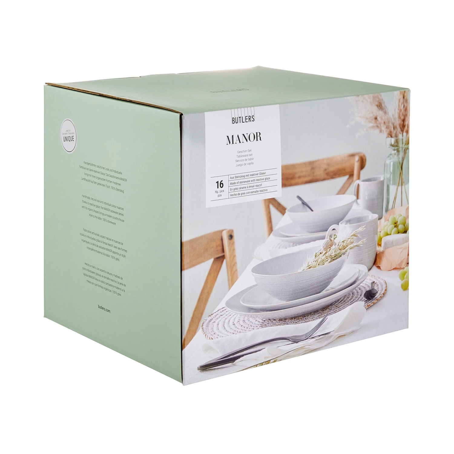 Handgetöpferter, natürlicher Look und zeitlose Farbgebung: Mit unserer Geschirrserie Manor in organischen Formen und klaren Farben bringen Sie den modernen Landhausstil auf Ihren gedeckten Tisch. Dabei besticht die Serie – wie hier das formschöne 16-teilige Geschirrset – mit naturverbundenem Charme, der sich auch hervorragend mit anderen Stilen kombinieren lässt. Durch die reaktive Glasur entsteht zudem ein besonderer Farbverlauf, der jedes Teil der Serie zum echten Unikat macht. Die hochwertige Verarbeitung sorgt überdies dafür, dass Manor das perfekte Geschirr für den täglichen Gebrauch ist.