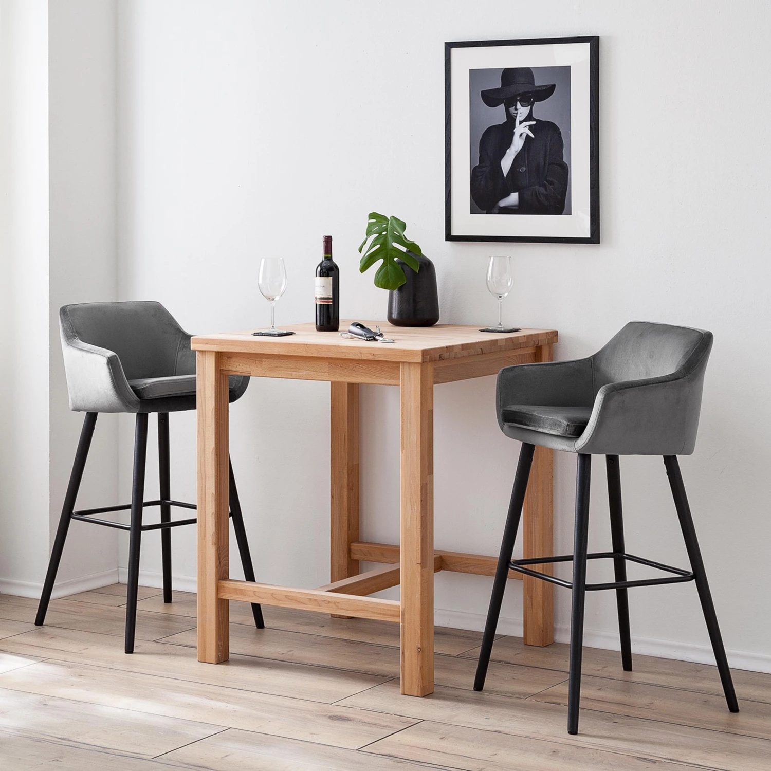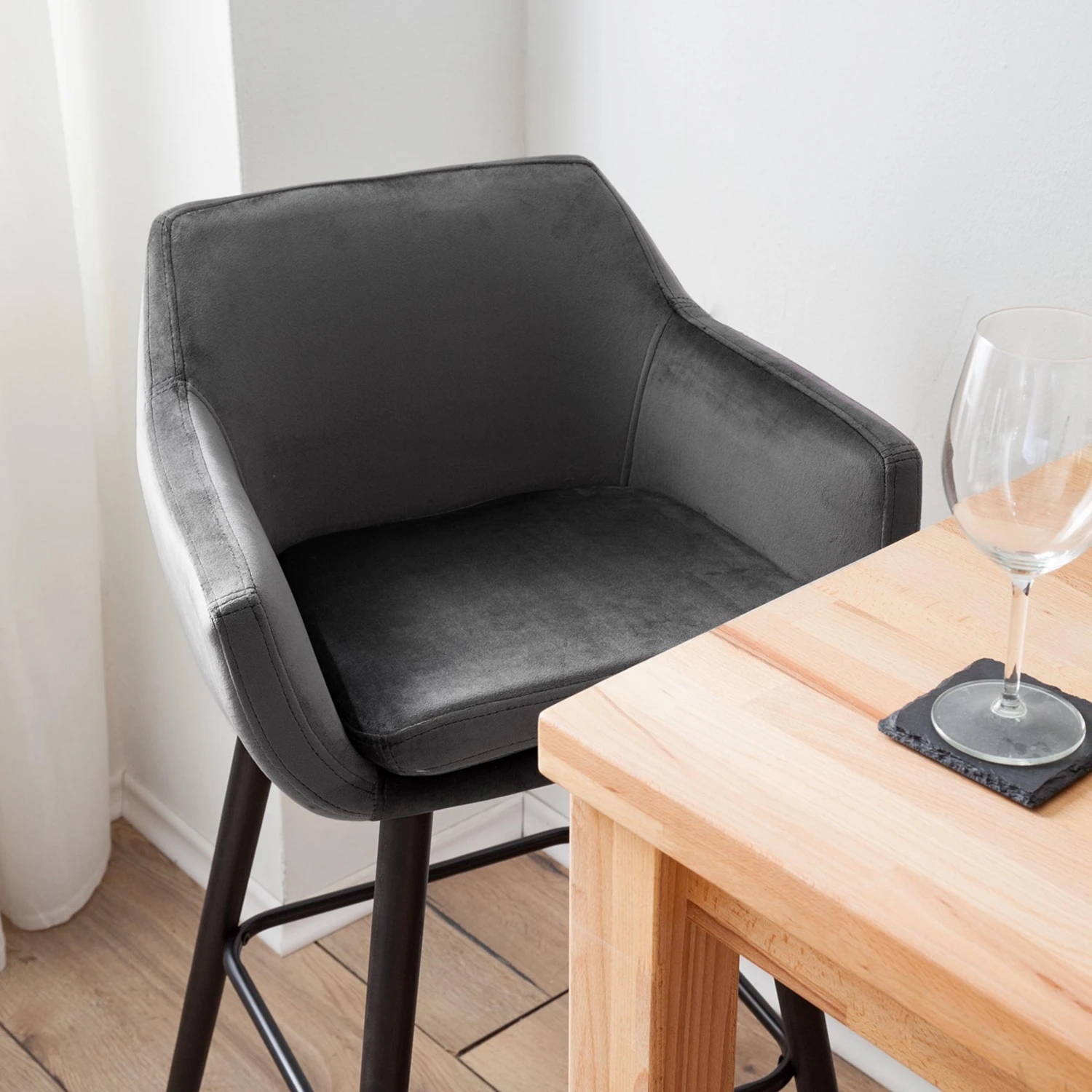 Nicholas III ist unser bequemster Barstuhl. Er hat einen breiten, gepolsterten Sitz und eine Fußstütze, die sich perfekt an Ihren Körper anpasst. Der Stuhl ist aus massivem Eichenholz gefertigt und mit einer hochwertigen Samtbezug erhältlich.